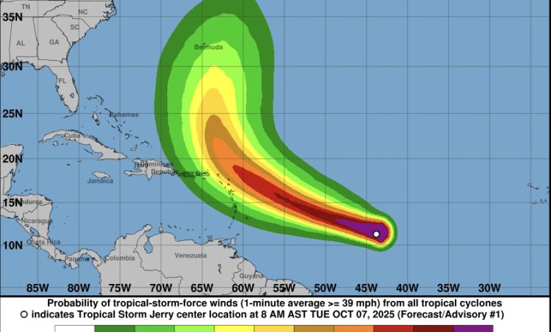 Los meteorólogos del NHC, con sede en Miami, prevén un fortalecimiento constante y estiman que Jerry podría convertirse en huracán en uno o dos días.